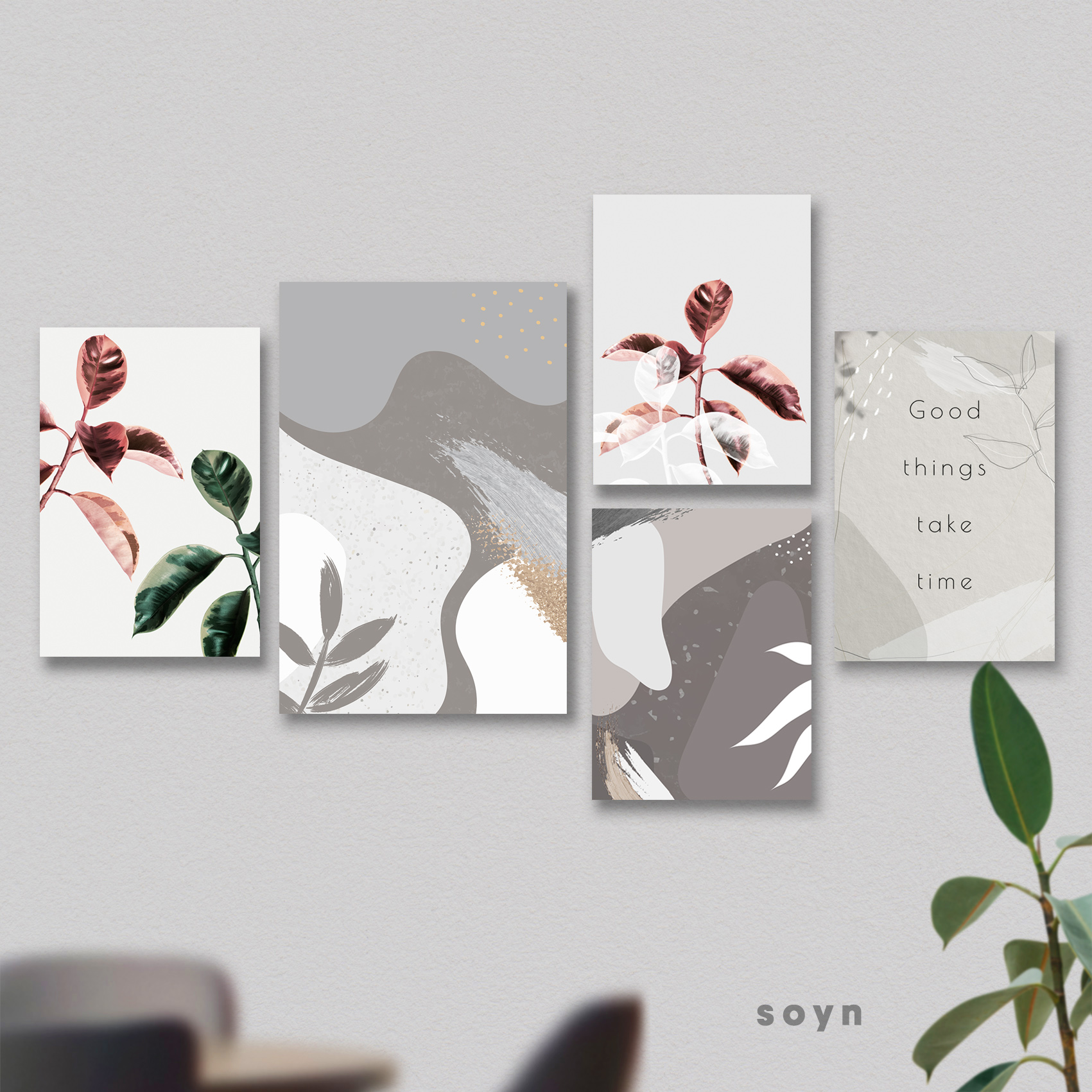 Kích thước: Từ trái qua 30x45cm, 40x60cm, 30x40cm, 30x40cm, 30x45cm, tổng kích thước ngang 160cm, dọc 90cm (khoảng cách mỗi tranh 10cm).