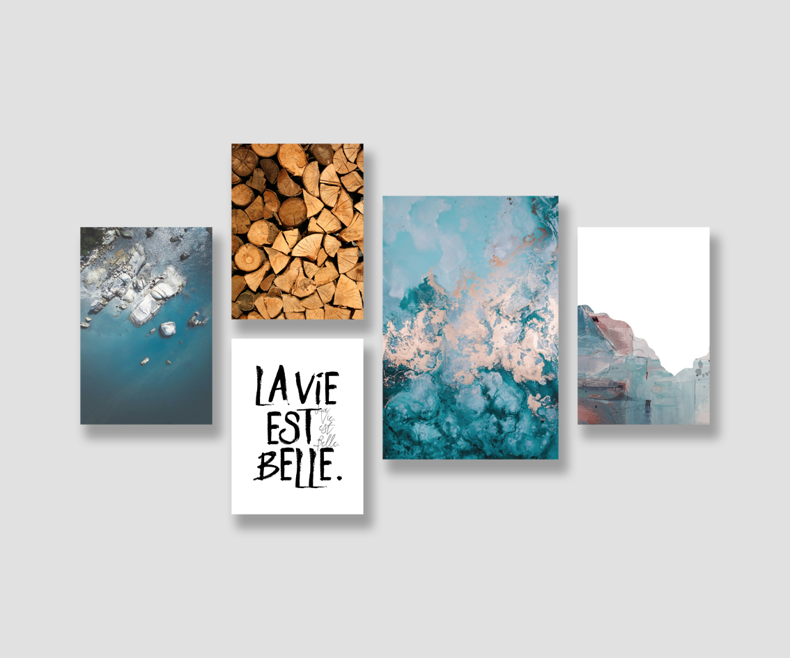 Kích thước: Từ trái qua 30x45cm, 30x40cm, 30x40cm, 40x60cm, 30x45cm, tổng kích thước ngang 160cm, dọc 90cm (khoảng cách mỗi tranh 10cm).