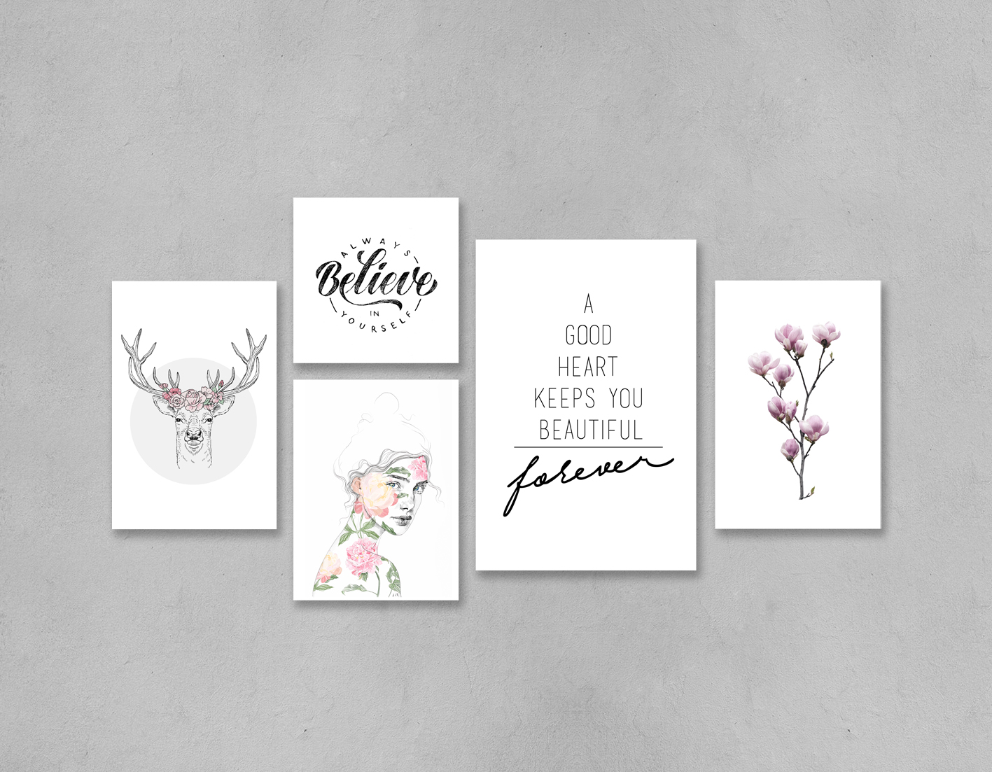 Kích thước: Từ trái qua phải, trên xuống: 30x45cm. 30x30cm, 30x40cm, 40x60cm, 30x45cm. Tổng kích thước ngang 150cm, dọc 80cm (bao gồm khoảng cách 5cm)