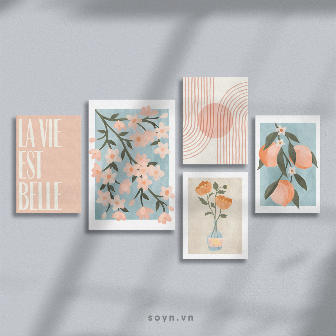 Kích thước: 1 bức 40x60cm, 2 bức 30x45cm, 2 bức 30x40cm. Tổng kích thước cả set (bao gồm khoảng cách treo tranh 5cm) có chiều ngang 145cm, chiều cao 85cm.
