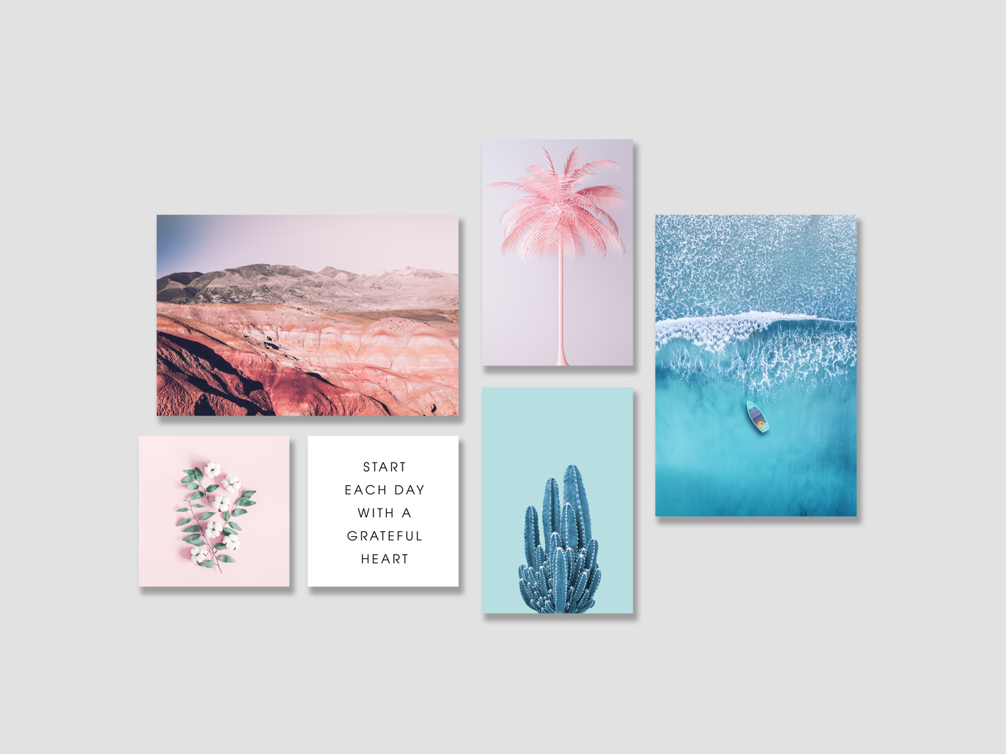Kích thước: từ trái qua 40x60cm, 30x30cm, 30x30cm, 30x45cm, 30x45cm, 40x60cm, tổng kích thước ngang khoảng 150cm, dọc 100cm, có thể treo thưa ra để tăng kích thước tổng thể.
