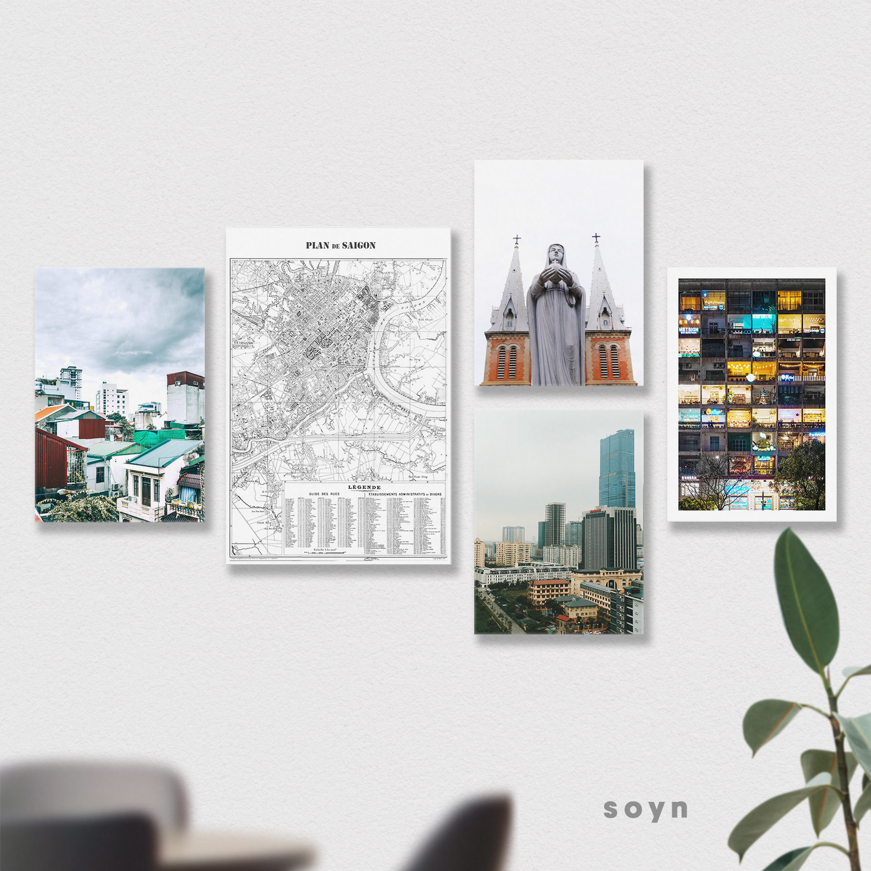Kích thước: Từ trái qua 30x45cm, 40x60cm, 30x40cm, 30x40cm, 30x45cm, tổng kích thước ngang 160cm, dọc 90cm (khoảng cách mỗi tranh 10cm).