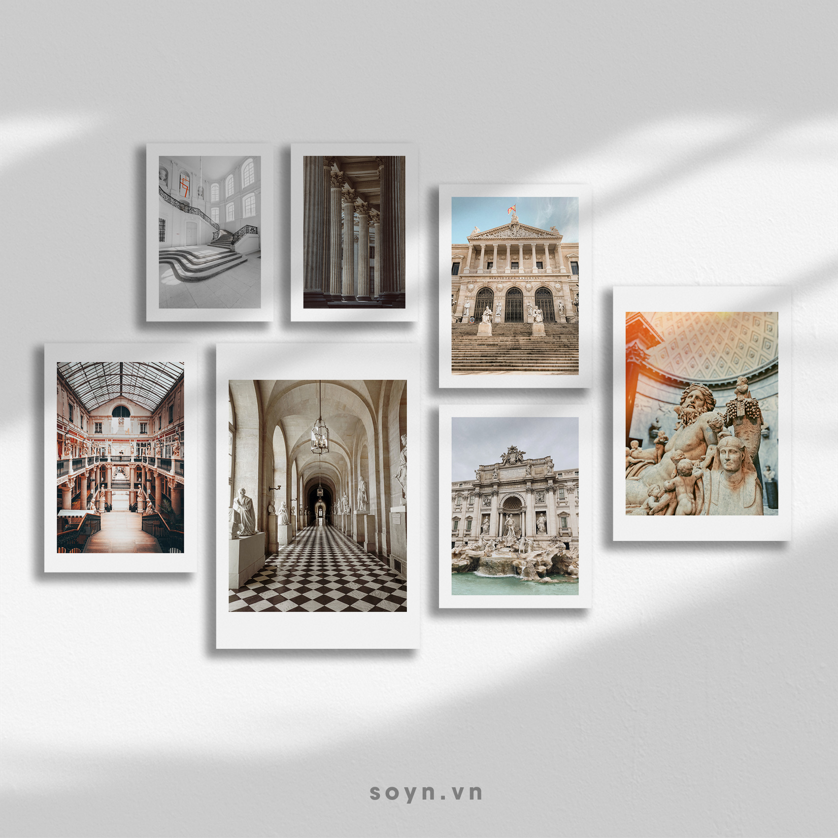 Số lượng tranh 7 bức bao gồm: 1 bức 40x60cm, 1 bức 35x50cm, 1 bức 30x45cm, 2 bức 30x40cm, 2 bức 20x30cm. Tổng kích thước cả set (bao gồm khoảng cách treo tranh 5cm) có chiều ngang 150cm, chiều cao 95cm.