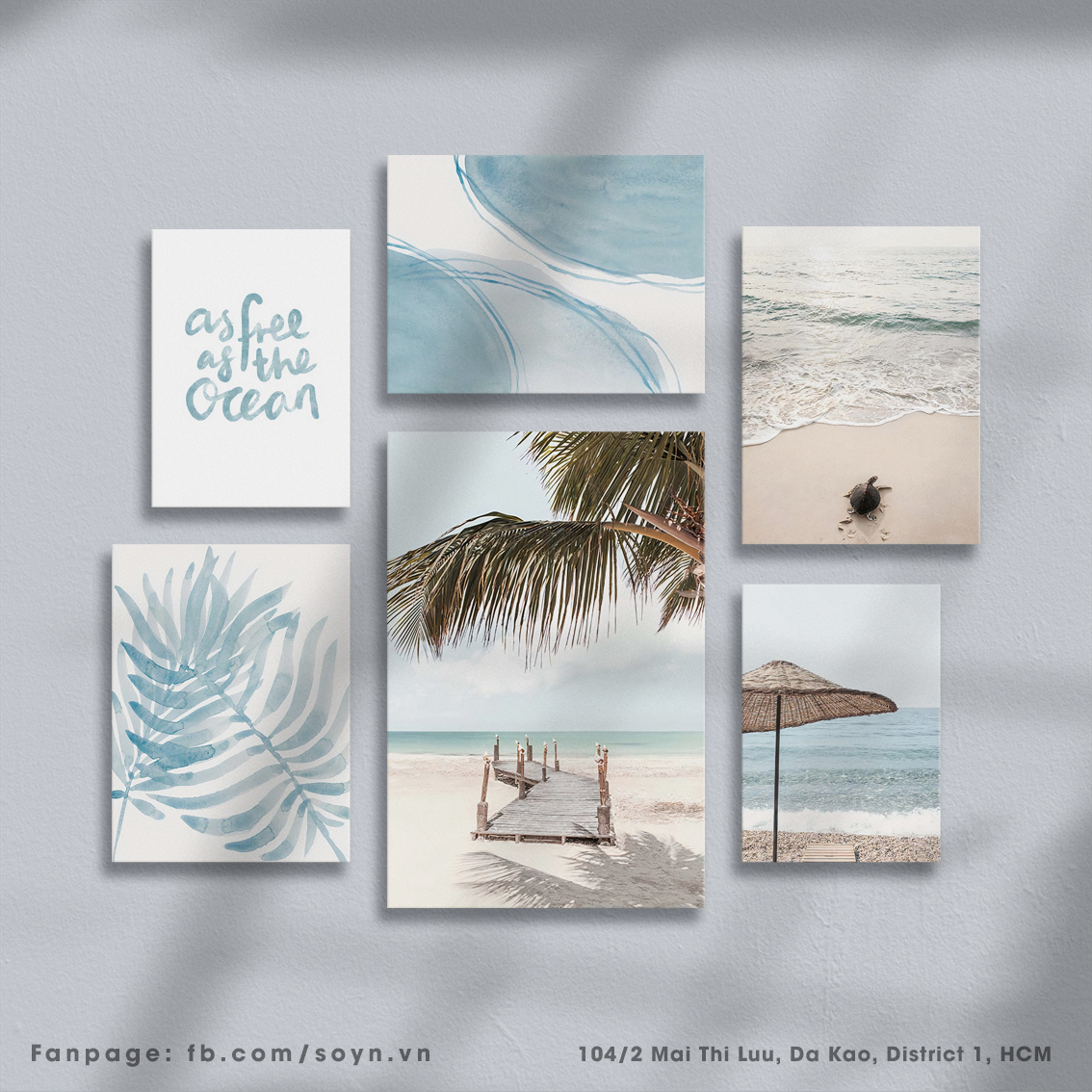 Kích thước:1 bức 40x60cm, 3 bức 30x40cm, 2 bức 25x35. Tổng kích thước cả set (bao gồm khoảng cách treo tranh 5cm) có chiều ngang 110cm, chiều cao 95cm. Kích thước phù hợp với mảng tường sau sofa (ngang 1m8 - 220cm), giường ngủ (1m8 - 2m) hoặc mảng tường trang trí không gian hiện đại bất kỳ.