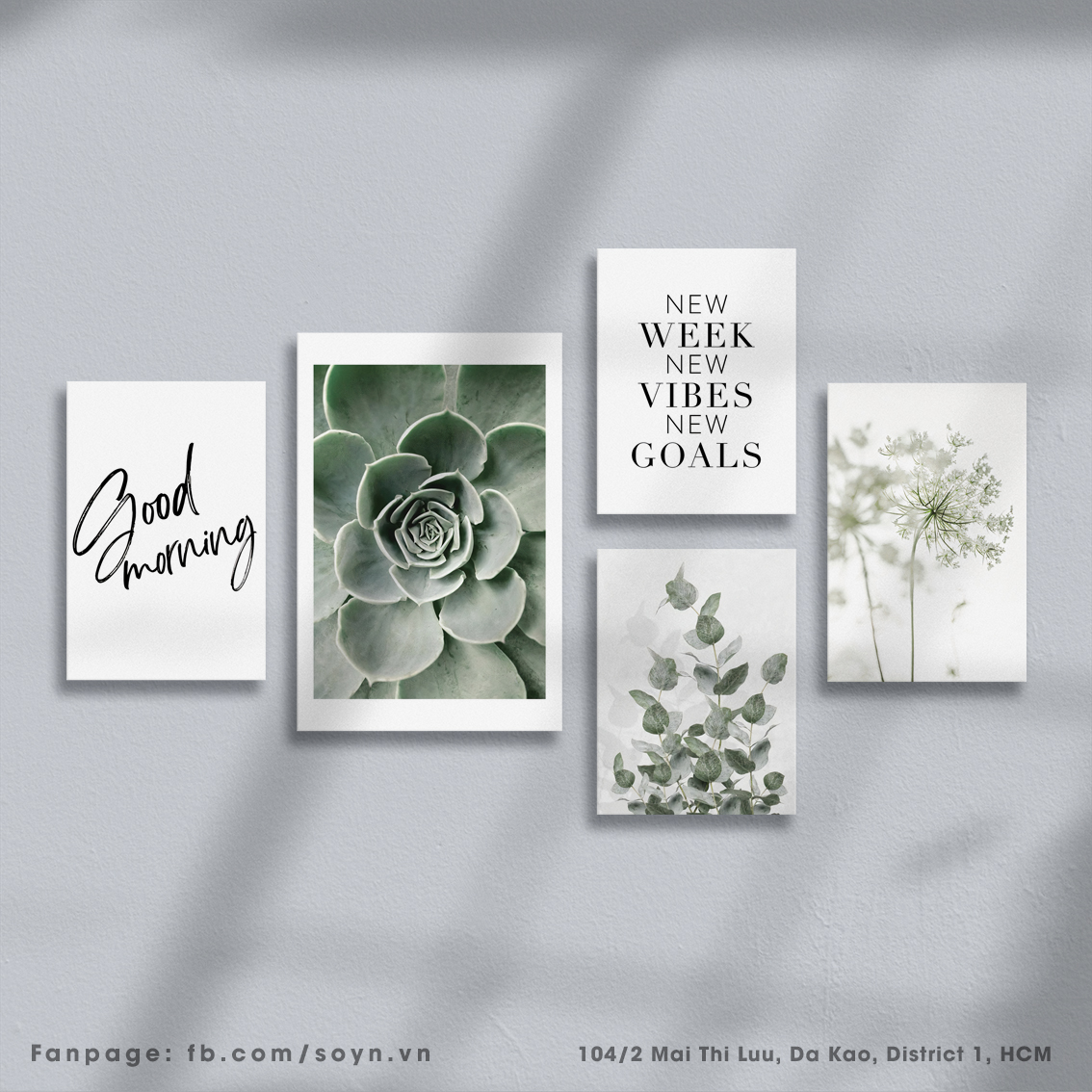 Kích thước: 1 bức 40x60cm, 2 bức 30x45cm, 2 bức 30x40cm. Tổng kích thước cả set (bao gồm khoảng cách treo tranh 5cm) có chiều ngang 145cm, chiều cao 85cm. Kích thước phù hợp với mảng tường sau sofa (ngang 1m8 - 220cm), giường ngủ (1m8 - 2m) hoặc mảng tường trang trí không gian hiện đại bất kỳ.