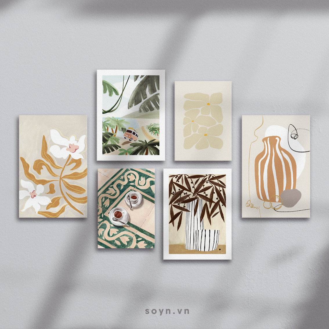 Kích thước: 2 bức 30x45cm, 2 bức 30x40cm, 2 bức 25x35cm. Tổng kích thước cả set (bao gồm khoảng cách treo tranh 5cm) có chiều ngang 130cm, chiều cao 85cm.