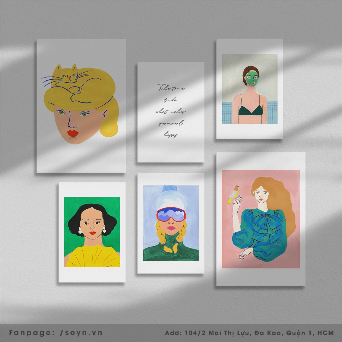 Kích thước: 2 bức 40x60cm, 4 bức 30x45cm. Tổng kích thước cả set (bao gồm khoảng cách treo tranh 5cm) có chiều ngang 120cm, chiều cao 110cm. Kích thước phù hợp với mảng tường sau sofa (ngang 1m8 - 220cm), giường ngủ (1m8 - 2m) hoặc mảng tường trang trí không gian hiện đại bất kỳ.