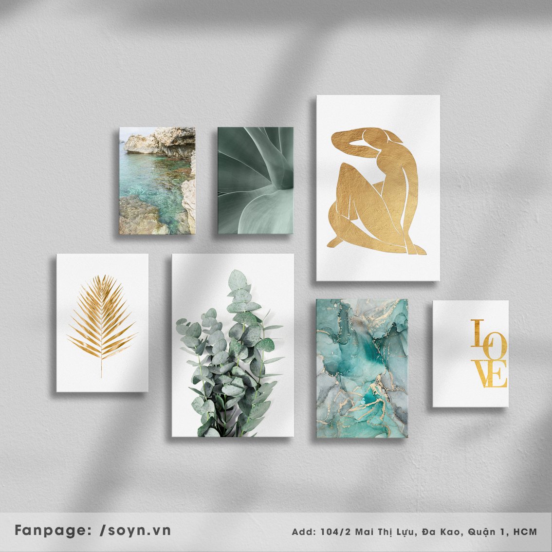 Kích thước: 2 bức 40x60cm, 2 bức 30x45cm, 3 bức 25x35cm. Tổng kích thước cả set (bao gồm khoảng cách treo tranh 5cm) có chiều ngang 140cm, chiều cao 110cm. Kích thước phù hợp với mảng tường sau sofa (ngang 1m8 - 220cm) hoặc giường ngủ (1m8 - 2m).