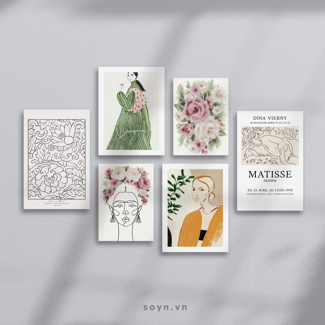 Kích thước: 2 bức 30x45cm, 2 bức 30x40cm, 2 bức 25x35cm. Tổng kích thước cả set (bao gồm khoảng cách treo tranh 5cm) có chiều ngang 130cm, chiều cao 85cm.
