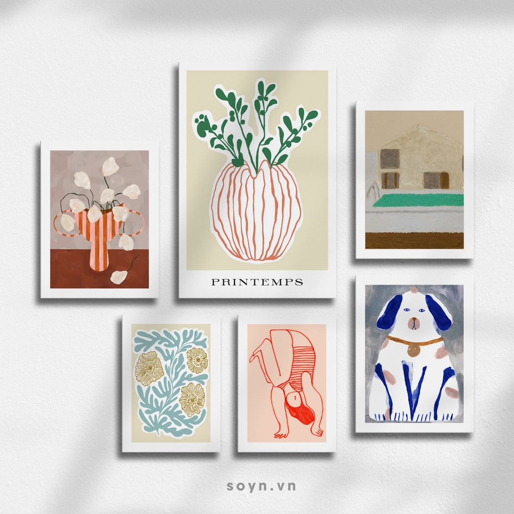 Số lượng tranh 6 bức bao gồm: 1 bức 40x60cm, 3 bức 30x40cm, 2 bức 25x35cm. Tổng kích thước cả set (bao gồm khoảng cách treo tranh 5cm) có chiều ngang 105cm, chiều cao 100cm.