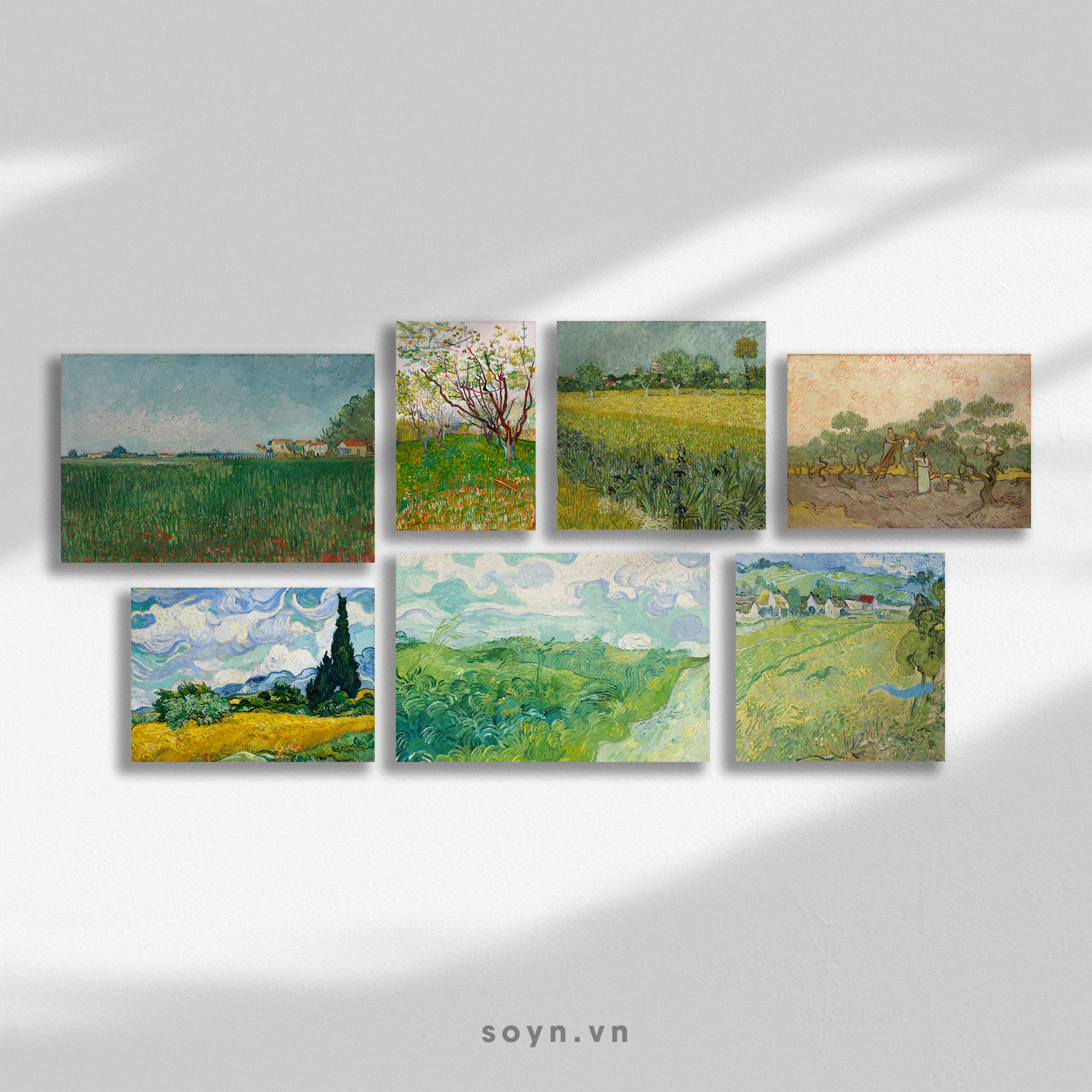 Số lượng tranh 7 bức bao gồm: 2 bức 30x45cm, 2 bức 30x30cm, 2 bức 25x35cm, 1 bức 20x30cm. Tổng kích thước cả set (bao gồm khoảng cách treo tranh 5cm) có chiều ngang 145cm, chiều cao 65cm.