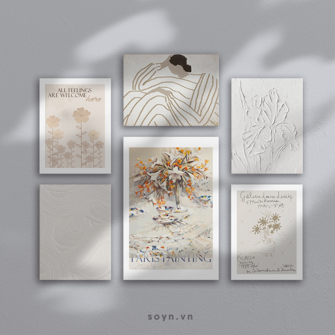 Kích thước: 1 bức 40x60cm, 5 bức 30x40cm. Tổng kích thước cả set (bao gồm khoảng cách treo tranh 5cm) có chiều ngang 110cm, chiều cao 95cm. Kích thước phù hợp với mảng tường sau sofa (ngang 1m8 - 220cm), giường ngủ (1m8 - 2m) hoặc mảng tường trang trí không gian hiện đại bất kỳ.