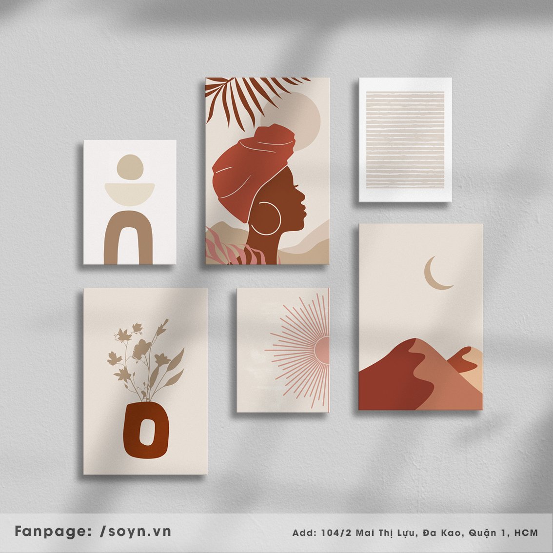 Kích thước: 3 bức 40x60cm, 3 bức 30x40cm. Tổng kích thước cả set (bao gồm khoảng cách treo tranh 5cm) có chiều ngang 120cm, chiều cao 125cm. Kích thước phù hợp với mảng tường sau sofa (ngang 1m8 - 220cm), giường ngủ (1m8 - 2m) hoặc mảng tường trang trí không gian bất kỳ.