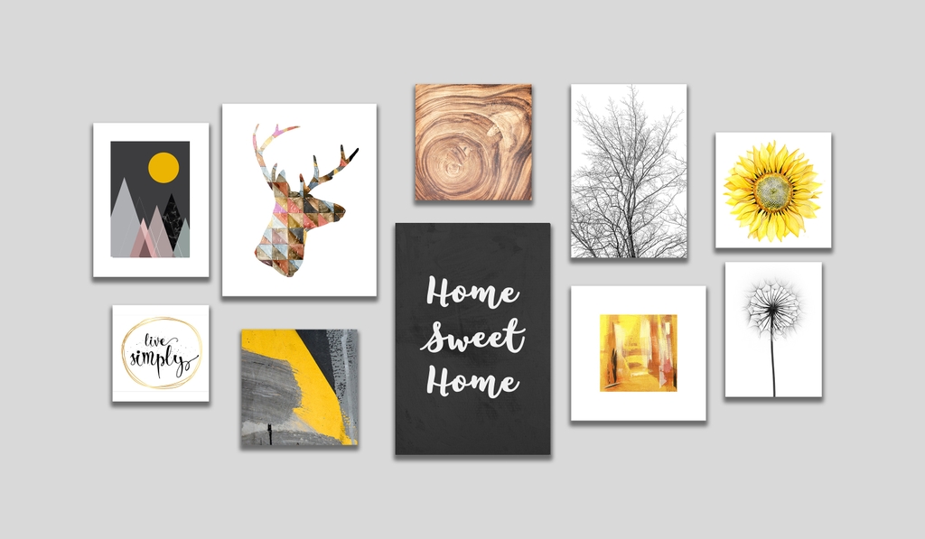 Kích thước: 30x40cm - 25x25cm - 40x50cm - 30x30cm - 30x30cm - 40x60cm - 30x45cm - 35x35cm - 30x30cm - 25x35cm (Tổng chiều ngang khoảng 2m, chiều dọc 1m, khoảng cách mỗi tranh 7cm ).