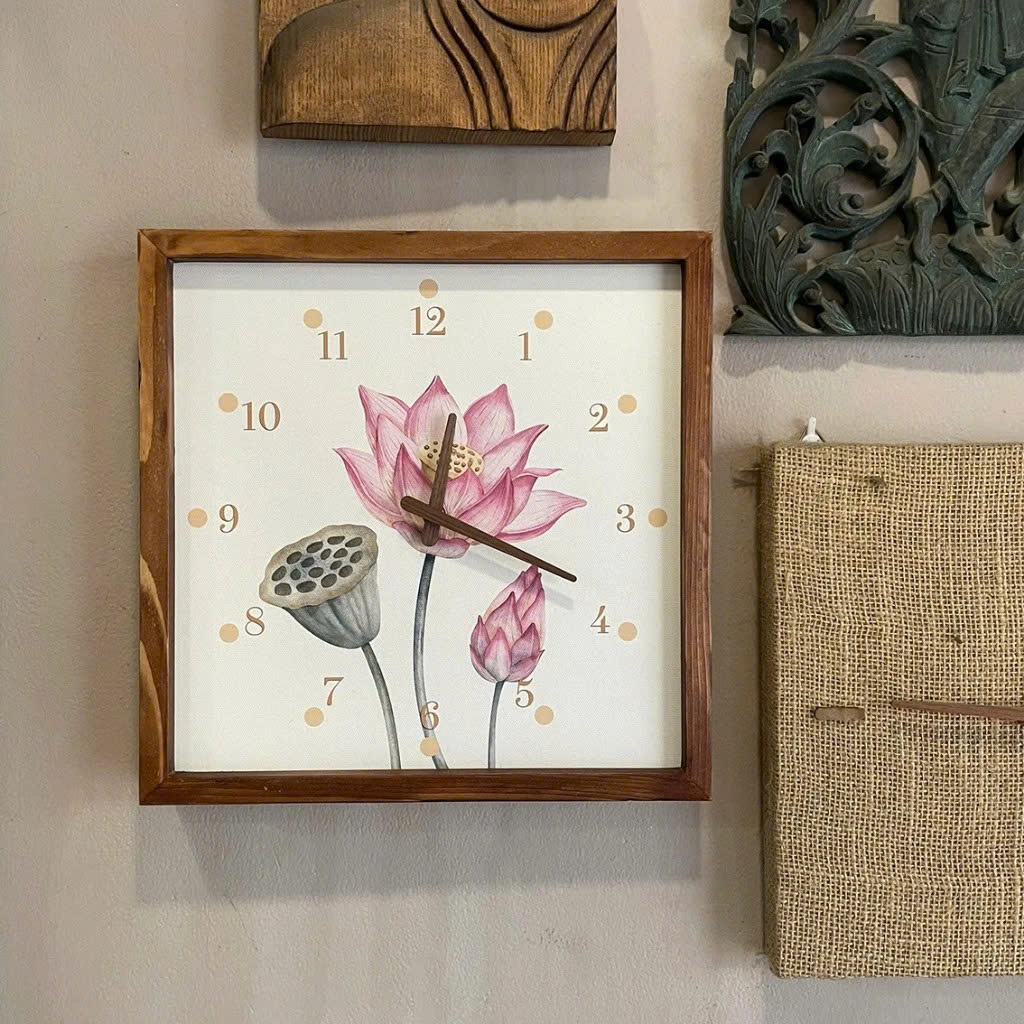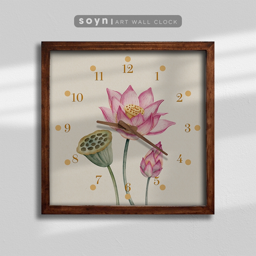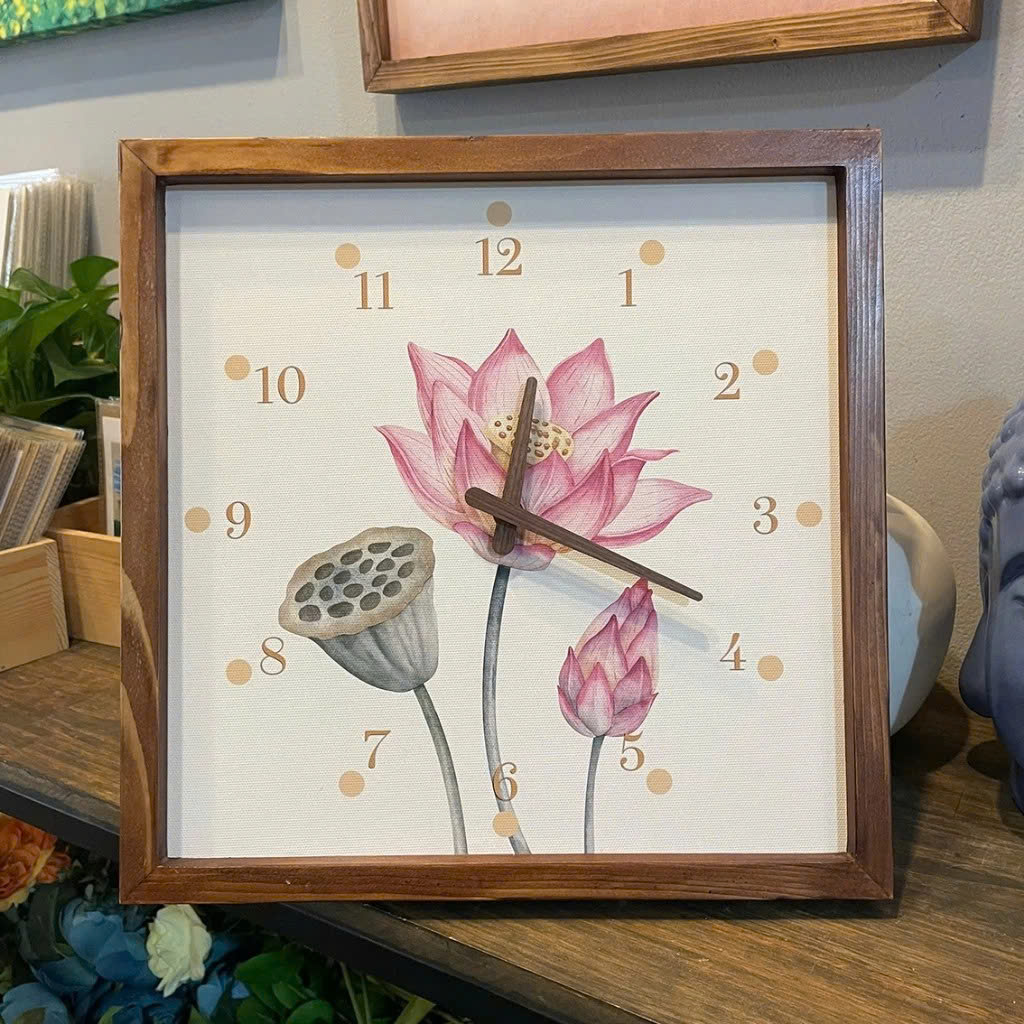 - Sản phẩm gồm bề mặt tranh in trên nền vải Cotton Canvas cao cấp với hình ảnh Hoa sen, khung viền gỗ tự nhiên, máy kim trôi không gây tiếng ồn và điểm thú vị nữa là bộ kim đồng hồ cũng được làm bằng gỗ rất tỉ mỉ.