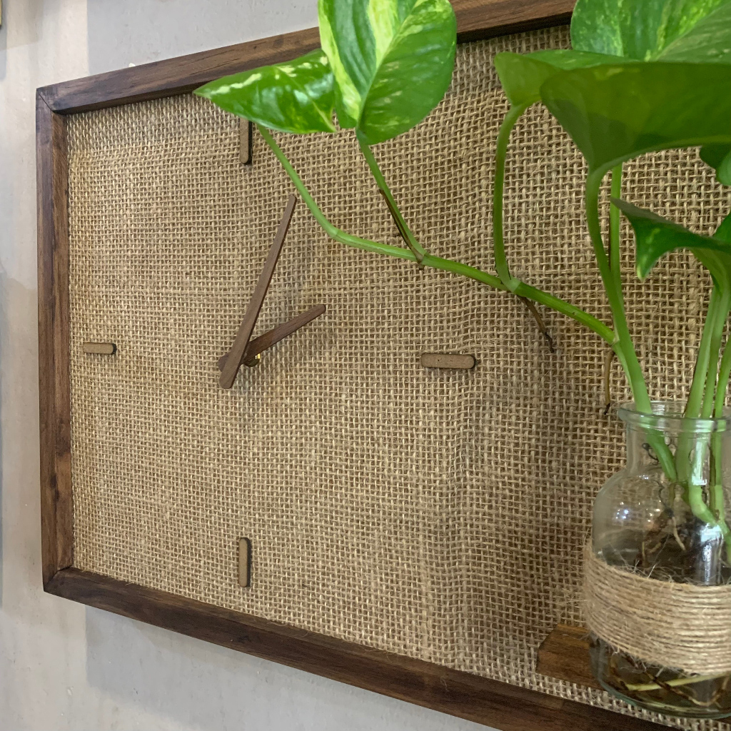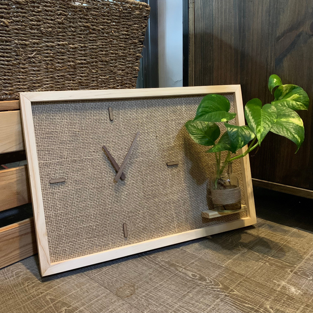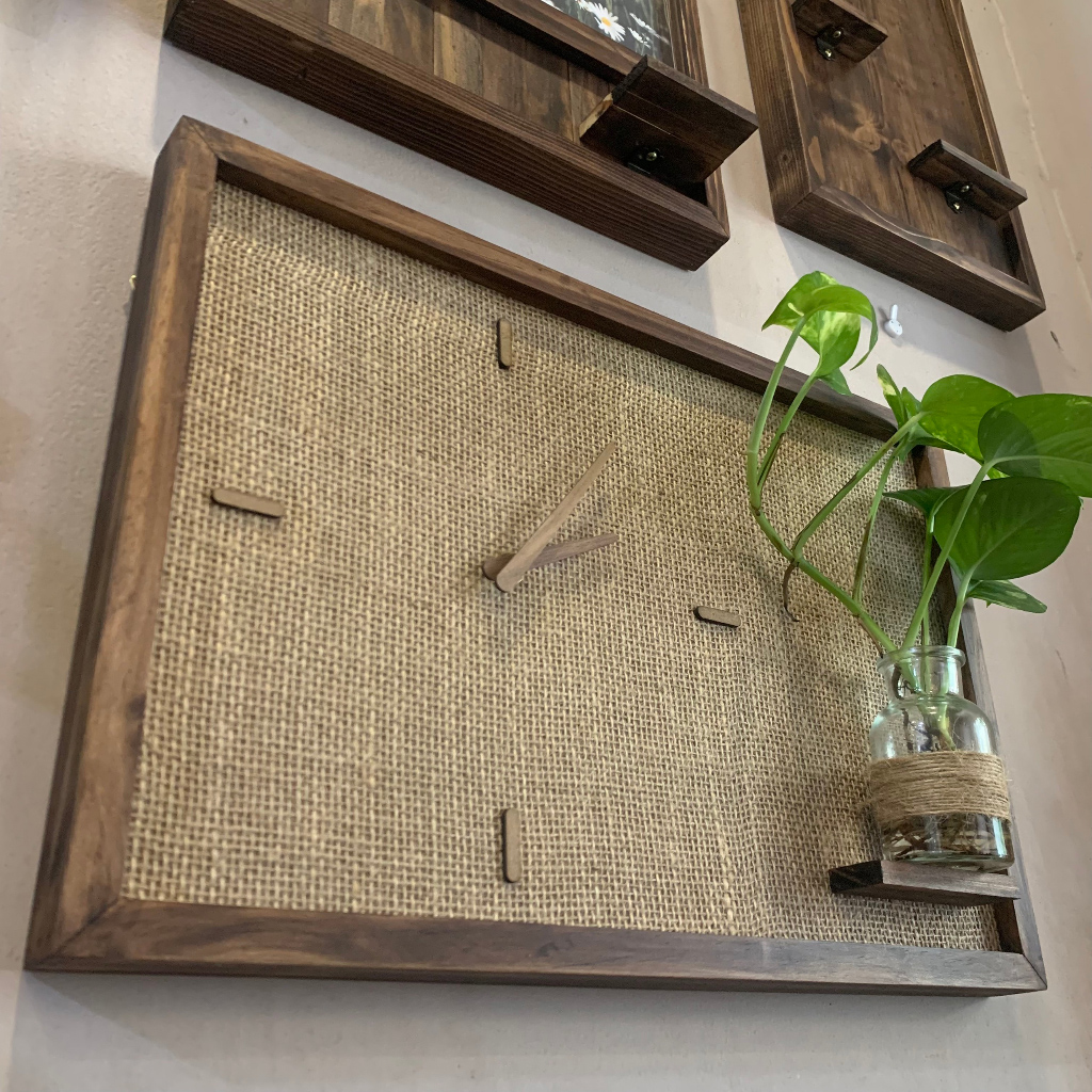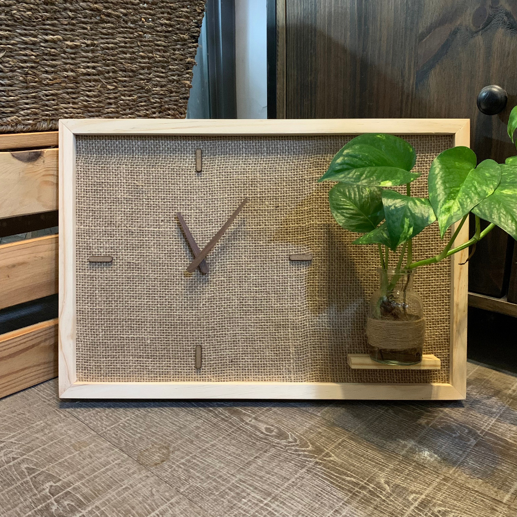 - Sản phẩm gồm bề mặt vải đay bố cán lên tấm gỗ dày, khung viền gỗ tự nhiên, máy kim trôi không gây tiếng ồn và điểm thú vị nữa là bộ kim đồng hồ cũng được làm bằng gỗ rất tỉ mỉ.