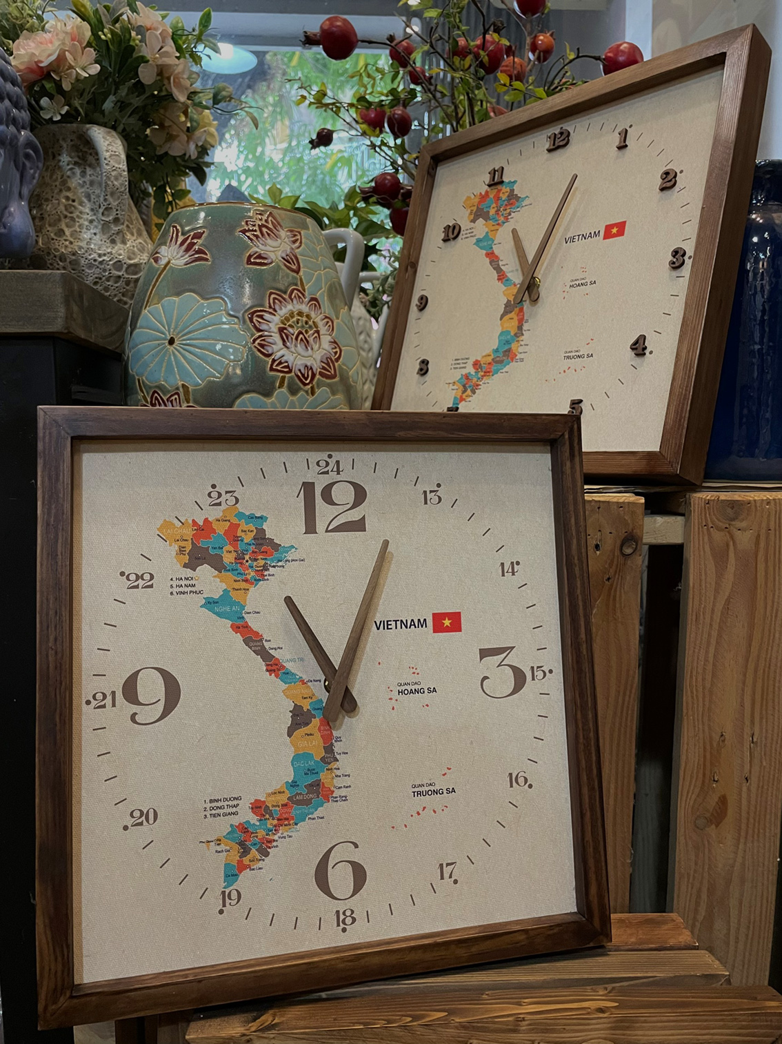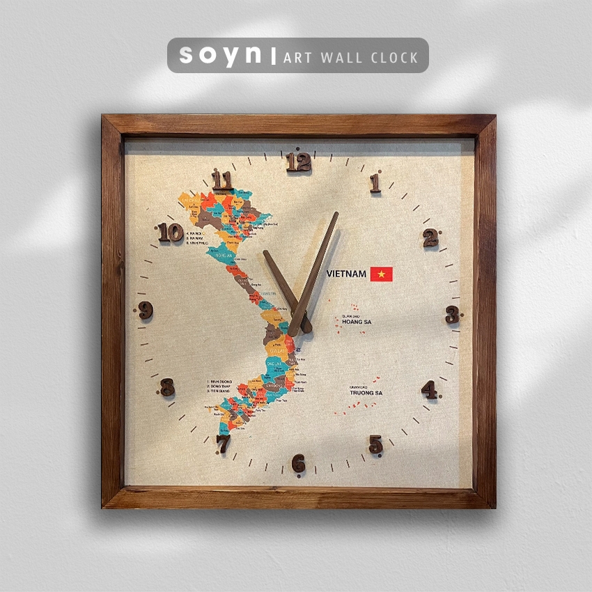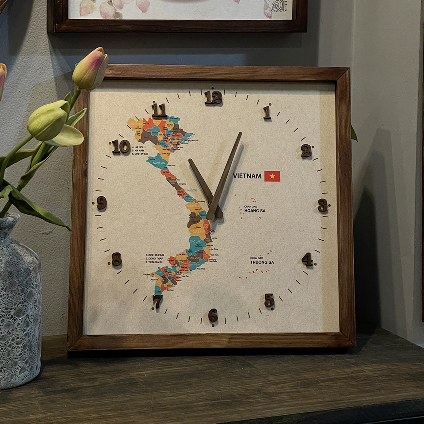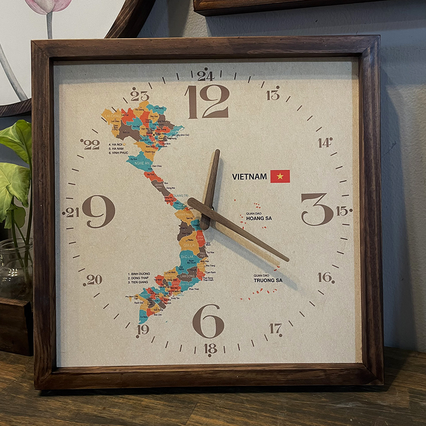 - Bề mặt đồng hồ là tranh được in trên chất liệu vải bố mỹ thuật Cotton Canvas nhám (loại vải thường dùng để vẽ tranh) sắc nét, tựa như tranh vẽ tay. Hình ảnh là bản đồ Việt Nam hình chữ S thể hiện vị trí địa lý các tỉnh, thành phố.