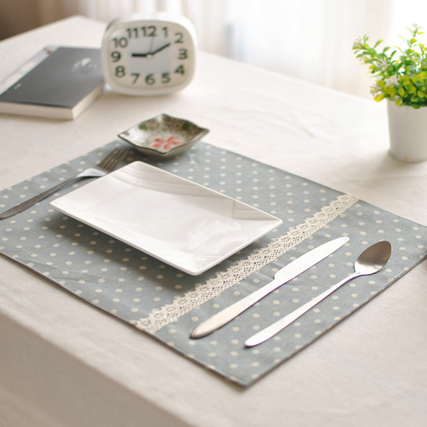 Tấm lót bàn ăn họa tiết chấm bi xanh da trời có thêu ren (DN06)