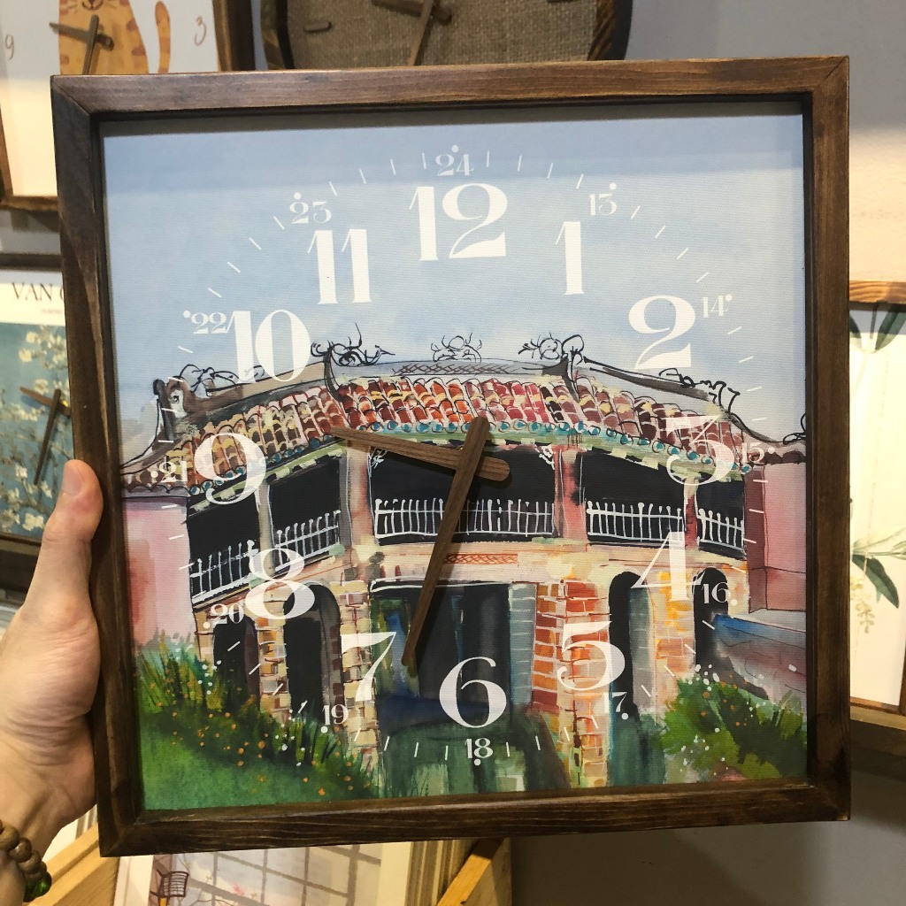 - Sản phẩm gồm bề mặt tranh in trên nền vải Cotton Canvas cao cấp với hình ảnh vẽ về Chùa Cầu - Hội An rất đẹp, khung viền gỗ tự nhiên, máy kim trôi không gây tiếng ồn và điểm thú vị nữa là bộ kim đồng hồ cũng được làm bằng gỗ rất tỉ mỉ.